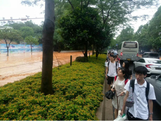 大雨步行前往赛区交通瘫痪现场 郑伟国摄