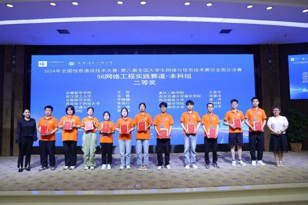 我校21级电子信息科学与技术刘德霖荣获本科组赛道二“光宽带网络工程实践赛”全国总决赛一等奖;22级电子信息科学与技术陈纯虹荣获本科组赛道一“5G网络工程实践赛”全国总决赛二等奖;21级电子商务肖雪婷荣获本科组赛道二“光宽带网络工程实践赛”全国总决赛二等奖;23级电子信息科学与技术李灵辉、黄忠成、陈文涛、李佳莹荣获本科组赛道三“开源鸿蒙原生应用设计赛”全国总决赛三等奖。