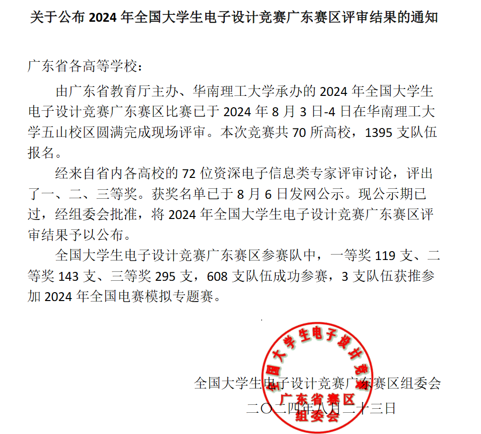 2024年8月3日,2024 年全国大学生电子设计竞赛广东赛区-模拟电子系统专题赛,在广州市华南理工大学五山校区举行。此次竞赛旨在激励高校在教育教学过程中,着重培养大学生的创新思维、团队合作精神,同时加强学生动手能力的培养和工程实践素质的训练,进一步推动课外科技活动的蓬勃发展,促进产学研深度融合,为优秀人才的涌现搭建广阔平台。