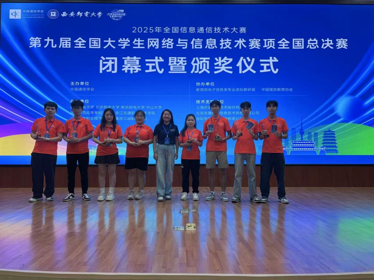2025年8月21日-23日,第九届全国大学生网络与信息技术大赛全国总决赛在西安邮电大学圆满落幕。本届大赛共吸引了来自全国500多所高等院校的近万名学生参赛。赛事共设三大赛道,分别是5G网络工程实践赛、光宽带网络工程实践赛以及数字化场景设计与开发赛。本次全国总决赛,在太阳集团tyc138指导老师梁立容老师的带领下,我校学子在多个赛道中脱颖而出,取得优异成绩,共有5只队伍共计8人荣获国家级三等奖。其中,22级电子信息科学与技术陈纯虹、23级电子信息科学与技术李宇恒获荣本科组赛道一“5G网络工程实践赛”全国总决赛三等奖;23级电子信息科学与技术李杰武荣获本科组赛道二“光宽带网络工程实践赛” 全国总决赛三等奖;23级电子信息科学与技术李灵辉、赵嘉豪、古益川(队伍一)、23级电子信息科学与技术肖瑶、丁佳卿(队伍二)荣获本科组赛道三“数字化场景设计与开发赛”全国总决赛三等奖。