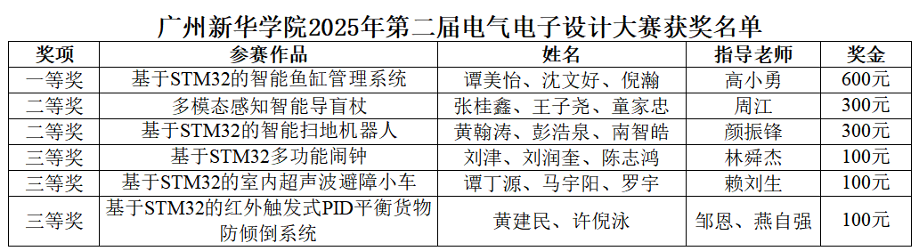 本次大赛共评选出一等奖1队、二等奖2队、三等奖3队。所有获奖者均获得由赛事组委会颁发的荣誉证书及奖金,奖金由深圳信盈达科技有限公司全程赞助,其中一等奖奖金600元/队、二等奖奖金300元/队、三等奖奖金100元/队。获奖队伍凭借突出的创新能力和过硬的实践水平,成为本次大赛的佼佼者,为广大同学树立了学习榜样。