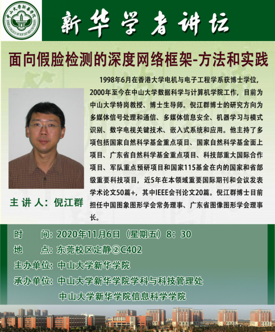2020年11月6日,由中山大学新华学院主办,中山大学新华学院学科与科技管理处和信息科学学院联合承办的学者讲坛《面向假脸检测的深度网络框架-方法和实践》在定静二C402举行。此次学者讲坛邀请到的嘉宾是中山大学特岗教授、博士生导师、新华学院信息科学学院学科带头人倪江群教授。本次讲座软件工程专业主任赵小蕾主持,信息科学学院黎良宇、陈怡华、卢渊等师生代表约80人参加了本次讲座。