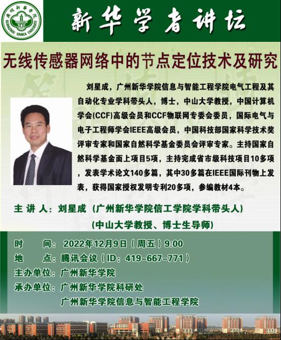 主讲人介绍:刘星成,广州新华学院太阳集团tyc138电气工程及其自动化专业学科带头人,博士,中山大学教授,中国计算机学会(CCF)高级会员和CCF物联网专委会委员,国际电气与电子工程师学会IEEE高级会员,中国科技部国家科学技术奖评审专家和国家自然科学基金委员会评审专家。主持国家自然科学基金面上项目5项,主持完成省市级科技项目10多项,发表学术论文140多篇,其中30多篇在IEEE国际刊物上发表,获得国家授权发明专利20多项,参编教材4本。