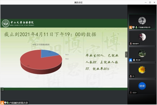2021届高校毕业生总规模约为909万人,首次突破900万大关,今年的政府工作报告也指出“做好高校毕业生、退役军人、农民工等重点群体就业工作。”然而,受新型冠肺炎疫情和其他因素的影响,今年高校的就业形式相对较为严峻。因此,为了更好地帮助同学们就业,掌握更多的就业信息,提高学生们的就业能力,2021年4月11日(周日)晚上19:00通过腾讯会议APP准时召开了线上的家长会,这次家长会是针对2017级电子信息科学与技术专业(以下简称为“17电子”)家长和学生召开的。出席本次家长会的成员有:17电子专业主任魏爱香老师、17电子专业主任梁立容老师、17电子辅导员卢锦澜老师、17电子班主任陈锦煌老师、17电子的家长和学生们、共计90余人。