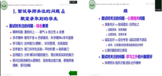 随后,刘教授为大家分享了在面试时导师所关注的问题如:综合素质能力(精神风貌、学习能力、动手能力、应用能力),心理相关问题(准备是否充分、是否过度紧张),学习之外的兴趣爱好(是否有体育特长、组织才能)。