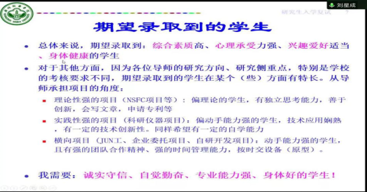 紧接着,刘教授为大家做了一些小结。总的来说,各大高校的导师希望能够录取到:综合素质高,心理承受能力强,兴趣爱好适当,以及身体健康的学生。