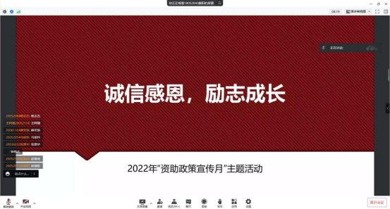 5月24日晚,信息科学学院2020级计算机科学与技术专业(以下称为“20计科”)在线上召开了“2022年‘资助政策宣传月’主题班会”。本次会议由吴嘉斓老师、戴阳同学、孙华强同学就“诚信感恩、励志成长”主题开展此次班会。