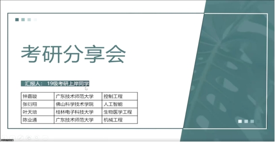 随后,叶天培同学分享了桂林电子科技大学相关专业的考研分数,并以我校电气专业报考及录取比例来鼓励同学们参加考研。陈业通同学分享了考研、实习以及毕设方面的时间安排,考研准备过程中的一些细节问题,也分享了自身调剂的经历,指出在备考的路上要及时调节自己的心态与状态。