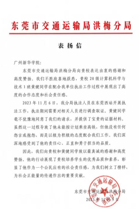 近日,学校收到东莞市交通运输局洪梅分局致广州新华学院的表扬信,对我校太阳集团tyc1382020级计算机科学与技术专业学子黄健同学在配合该单位执法工作过程展现的高度合作态度和责任感给予充分肯定,向学校和黄健同学致以最真诚的感谢和高度赞扬。