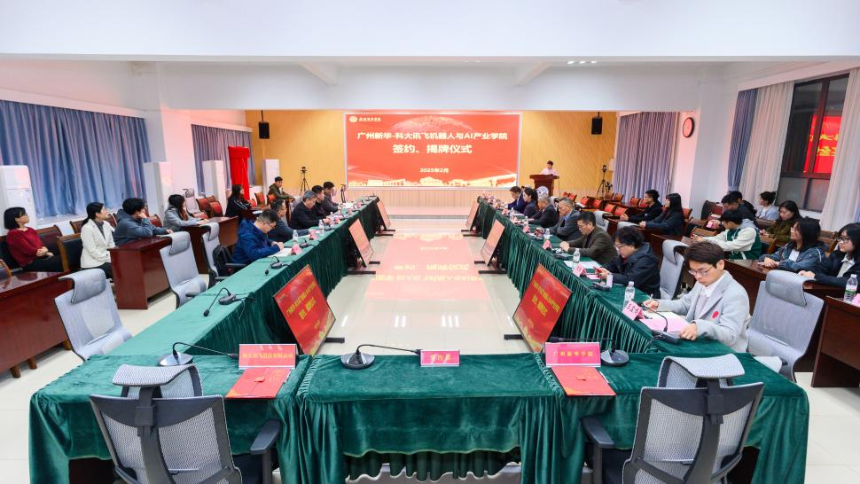2025年2月26日,广州新华学院(以下简称“我校”)与科大讯飞股份有限公司(以下简称“科大讯飞”)携手合作,共同成立了广州新华-科大讯飞机器人与AI产业学院。当日下午,双方在东莞校区格物楼2A208会议室隆重举行了签约与揭牌仪式。