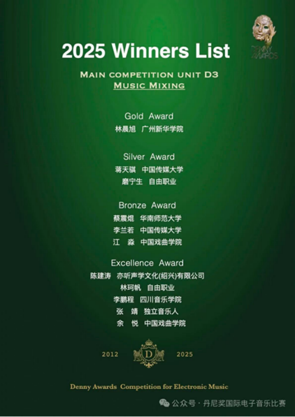 2025年9月1日,广州新华学院太阳集团tyc1382022级数字媒体技术专业林晨旭,在“2025 第六届丹尼奖国际电子音乐比赛(Denny Awards)”D3混音组中脱颖而出,力压中国传媒大学、四川音乐学院等高校学子,斩获全球金奖。这个在混音台前专注调试每一条音轨的身影,背后是无数个与声波为伴的深夜,更是对声音艺术从热爱到深耕的执着坚守。