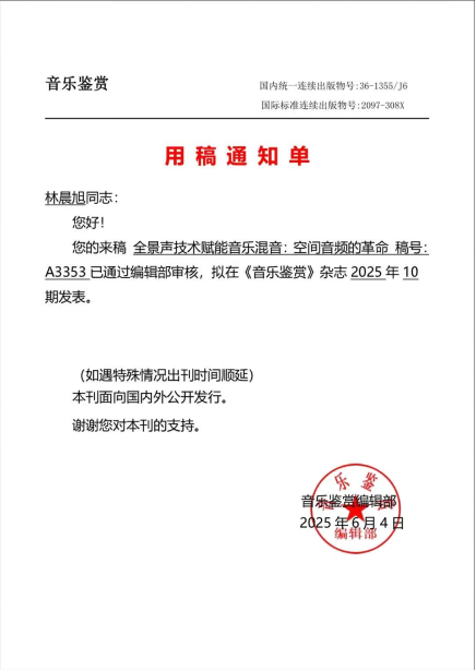 林晨旭同学的论文《全景声技术赋能音乐混音:空间音频的革命》已通过审核,拟于2025年10月发表于《音乐鉴赏》杂志,实现了“赛事成果与学术研究”的联动。