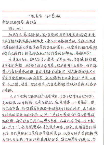 归国后,杨成伟同学心怀感恩,亲笔撰写感谢信。信中真挚地表达了对学校及学院悉心培育、慷慨资助的感激之情,回顾留学路上学院始终是他坚实的后盾,让他能无后顾之忧逐梦远方。这份感恩也化作他前行的动力,誓言要把留学所得回馈学院、惠及同学,带动身边人一同奋进。