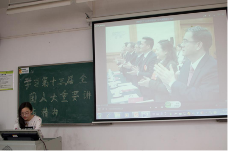 本次班会由辅导员周袁弘一主持,围绕三大点进行展开讲解,团支书牛童为同学们分享了十三届全国人大一次会议的重要讲话。