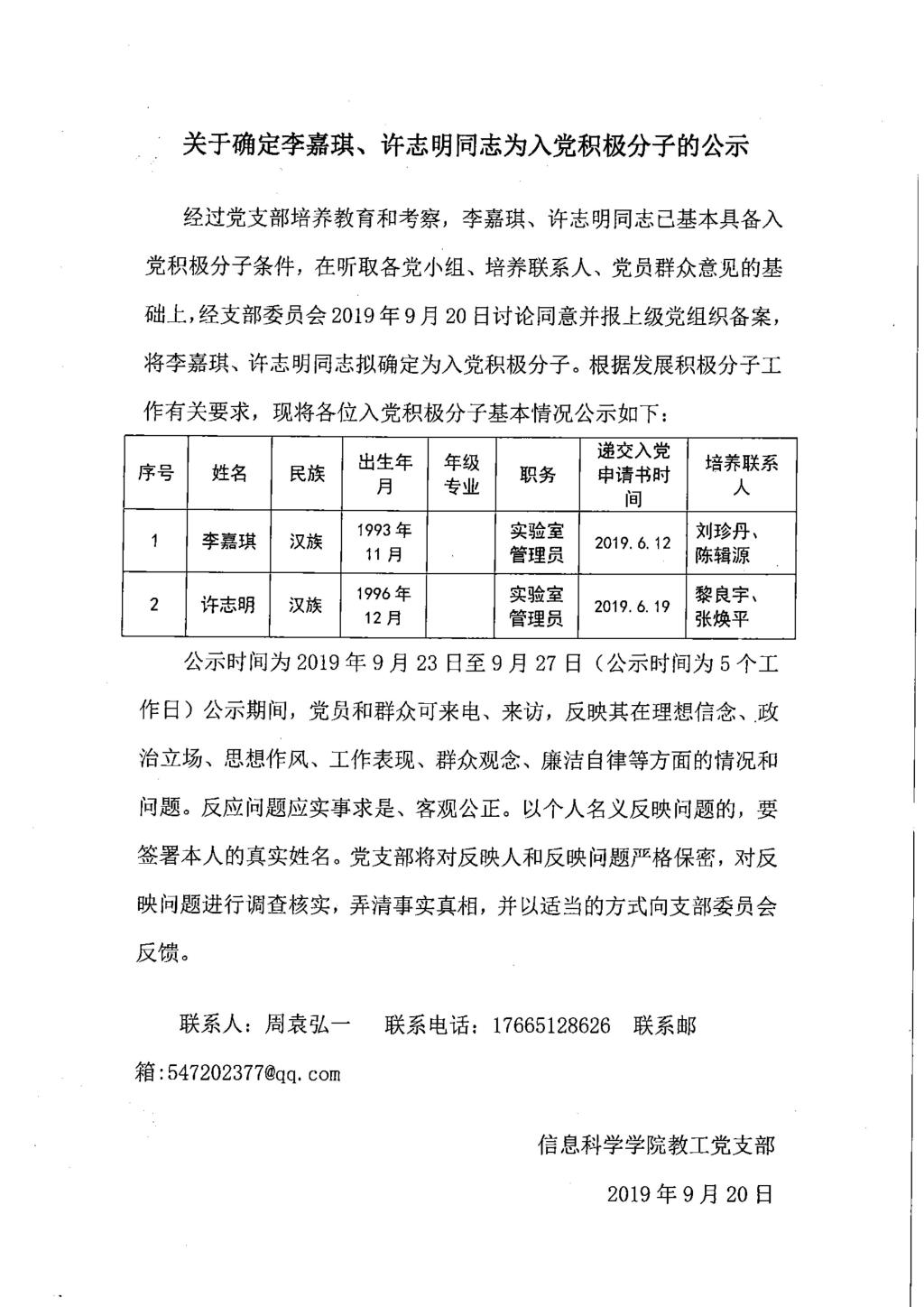 关于确定李嘉琪、许志明为入党积极分子的公示