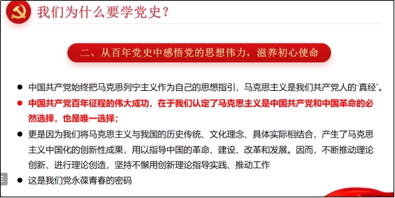 紧接着,衣杨从“学党史”这一主题出发,向我们讲述了如何树立正确的世界观,道德观,价值观,加深了我们对党的理论认识。她表示,深刻了解中国共产党的历史、宗旨和使命,能够帮助青年大学生增强爱国主义精神、坚定爱国主义信念、赓续爱国主义文化和发扬爱国主义优良传统。随后,衣杨从“继承与发扬党的成功经验和优良传统”,“从百年党史中感悟党的思想伟力,滋养初心使命”,“拓宽视野,增长见识”三个方面深度阐释了学党史的目的。