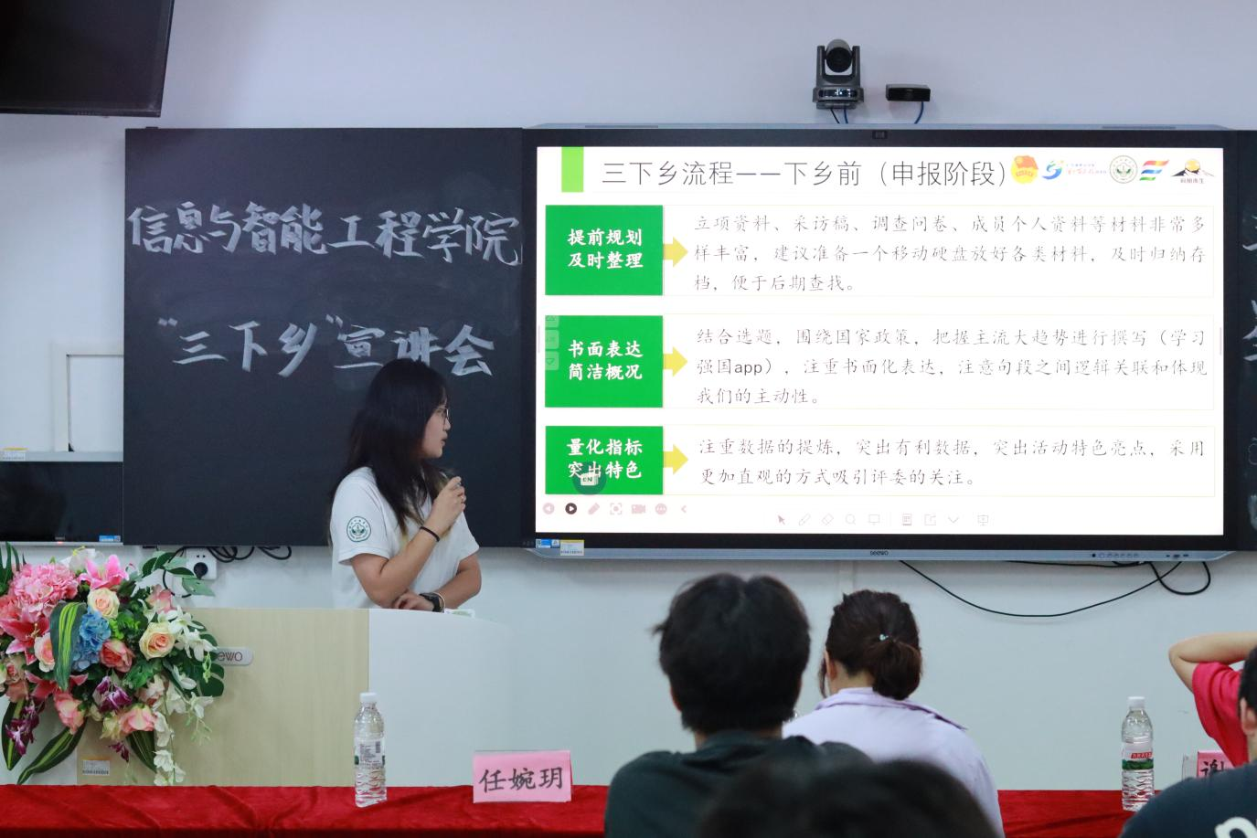 任婉玥同学从前期准备工作,包括 “三下乡” 流程梳理、团队架构搭建,到具体实施方案的制定与执行,再到对 “三下乡” 活动意义的深刻总结,进行了全方位、细致入微的分享。她的讲述让在场同学对 “三下乡” 前期部署有了更为详实、清晰的认识,为大家提供了极具价值的实践参考。