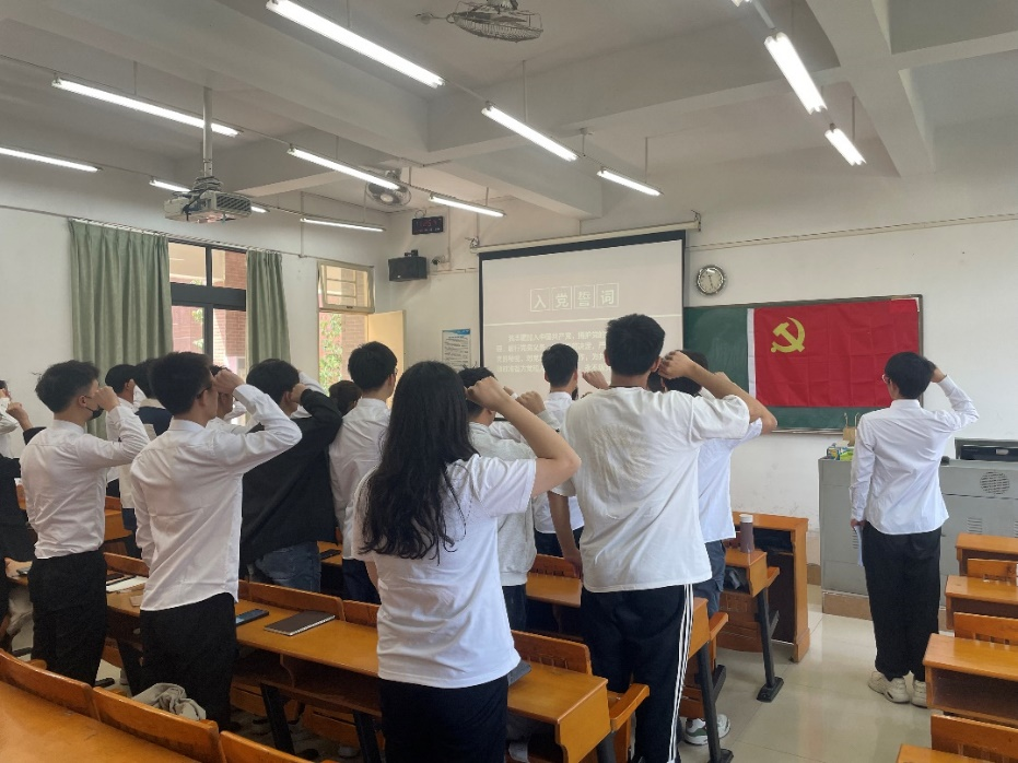 在庄严的宣誓环节,党支部书记朱特林老师带领全体党员面向党旗,高举右拳,重温入党誓词。"我志愿加入中国共产党......"的铮铮誓言响彻会场,字字千钧的承诺让每位党员心潮澎湃。这既是对党组织的庄严承诺,也是对青春使命的郑重宣誓,更吹响了奔赴新征程的奋进号角。
