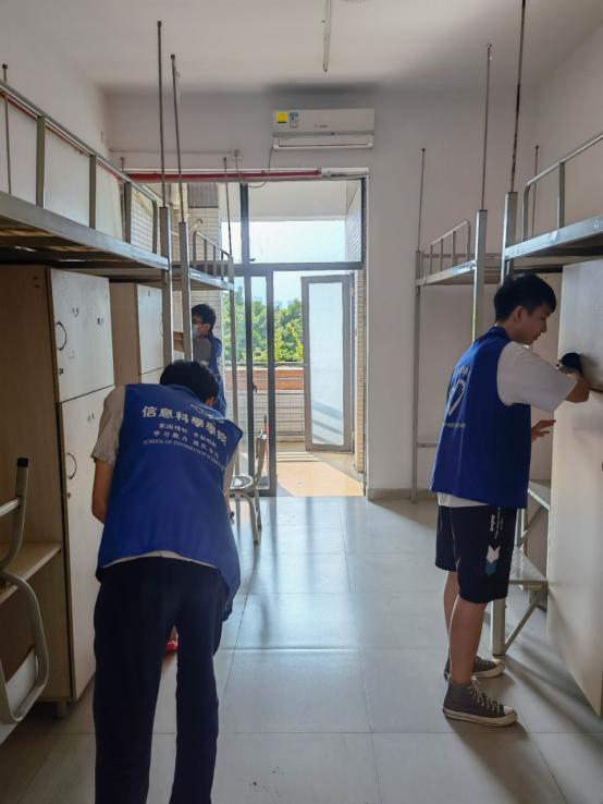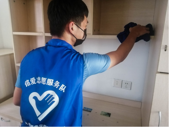 志愿者们忙碌的身影令人动容,他们认真擦拭每一个角落,仔细打扫地上堆积的杂物,他们“精益求精”,只为了给新生们提供一个更舒适的宿舍环境。