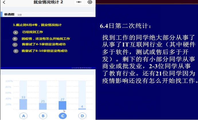 我院将持续跟进2020届毕业生就业情况,群策群力,争取就业率在8月30日初次就业率统计节点上再上升。通过本次总结会,进行深入反思,大学生就业工作反映了人才培养的质量,反映了人才培养的特色与社会需求的适应程度,因此强化人才培养,质量提高教育水平是关键。我院将强化基础能力,尤其强化与编程课程有关的理论课和实验课的教学水平;鼓励学生多多参加大学生学科竞赛,更好地提高学生实战经验;人才培养过程中,逐步进一步落实对学生团队合作能力、沟通表达能力、写作能力、以及阳光性格的培养,全面提升学生的就业能力。