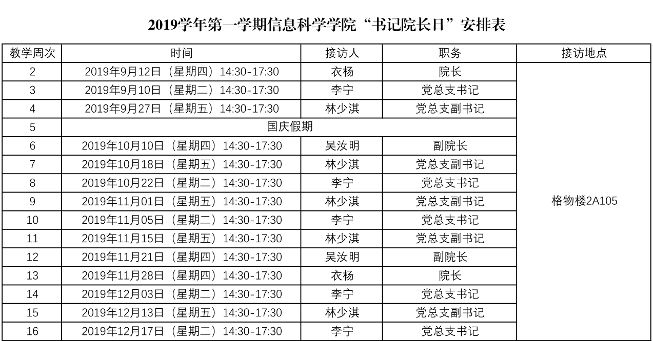 为进一步加强信息科学学院领导班子与广大师生的联系,更好地发扬民主,畅通言路,倾听呼声,广泛征集广大师生对学院建设发展的意见和建议,经信息科学学院党政联席会议研究决定,向全体师生公布本学期“书记院长日”工作安排。现将有关工作安排如下: