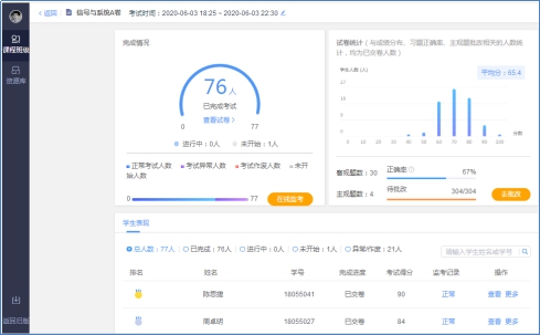 主观题批改完成后,考试数据就自动生成了,考试数据中详细标明了试卷名称、学生学号、姓名、得分、考试用时、交卷时间、客观题答案等。下载数据并保存,作为教务考试数据。
