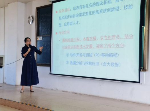 第三,介绍人才培养方向及特色。赵小蕾老师提出同学们要以软件开发与测试、数据分析与挖掘应用为方向不断学习,努力打下扎实的理论基础,成为适应技术进步与社会需求的人才。特别强调了同学们要“抓基础,重实践,强应用”。
