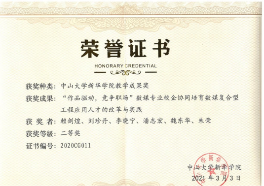 数媒在校企合作教学方面获得多项成果,2021年3月“作品驱动、竞争职场”数媒专业校企协同培育数媒复合型工程应用人才的改革与实践荣获中山大学新华学院教学成果奖二等奖。