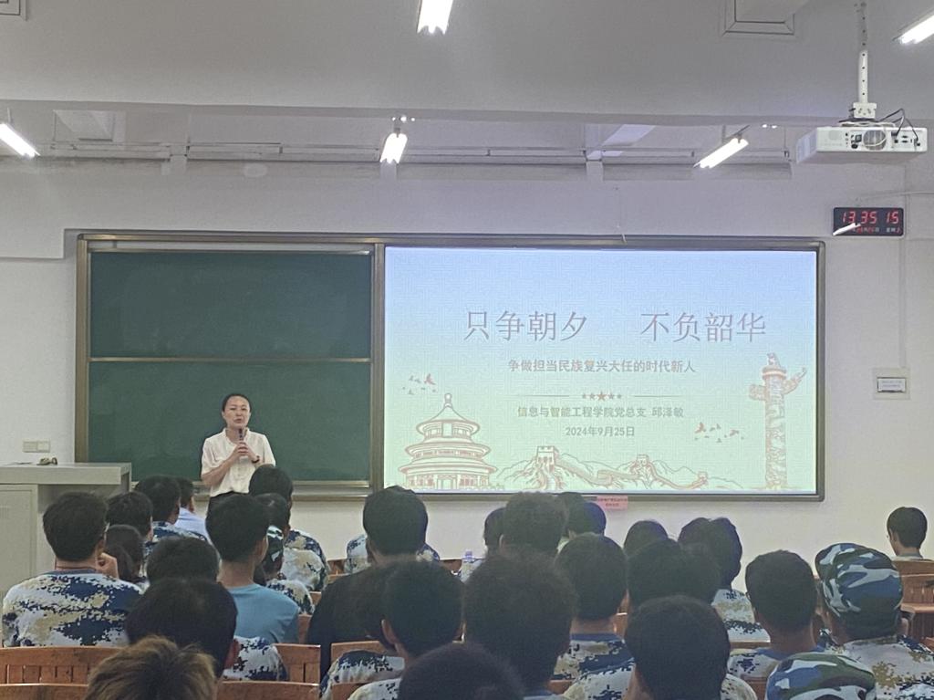 在金秋送爽、硕果累累的季节里,太阳集团tyc138于2024年9月25日,在定静楼1B202教室召开以“只争朝夕,不负韶华”为主题的秋季学期思政第一课。学院党总支书记邱泽敏主讲,学院老师、2024级计算机科学与技术专业新生参加。